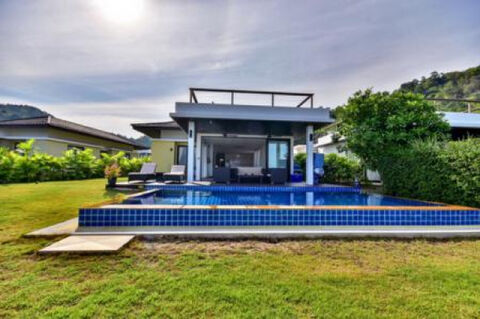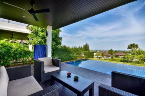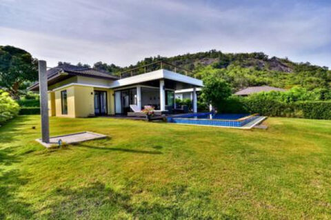 Lovely 3 Bed Pool Villa with sea and mountain views and views over the beautiful free form massive communal pool and restaurant. The Villa is designed to give the best views all round with unique fully sliding doors to open up the living room that leads directly on to the covered terrace and decking by the pool. From the living room is the dining area and modern kitchen with feature island for entertaining and convenient work surface. The Master bedroom also leads directly to the covered terrace and decking and has a large en-suite bathroom and built-in wardrobes. There are 2 good sized guest bedrooms with built-in wardrobes and a large family bathroom in between with bath and shower. There is also a storage room and small guest WC. Outside is a lovely tropical garden, 8m x 4m infinity edge pool with sea views and a spiral stair case taking you to a very useful terrace designed as a sun deck and BBQ area with some of the best views in Hua Hin. The Villa is within a Resort Development which has 24 hr reception, pool and garden service, shuttle bus into town, massive communal pool and feature raised restaurant and bar on a small hillside.