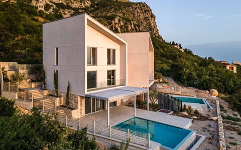 Each villa has four levels. On the first level, a double-height living room, dining area, and modern kitchen are arranged in an open plan, seamlessly continuing to the outside terraces, infinity pool, and landscaped garden overlooking the Adriatic Sea. The second level consists of an entrance gallery with a sea view of the double-height living room, master bedroom with sea view, ensuite bathroom, walk-in changing room, and free-standing bath with sea view. On the third level, there are two double bedrooms with sea views, one single bedroom, and two bathrooms with mountain views. The plant room and large storage area are positioned at the top.