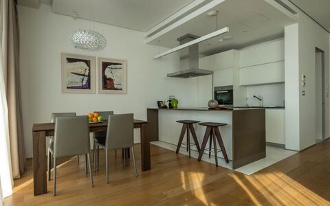 This 95m2 apartment for sale consists of an open-plan living room with a terrace that has a magnificent sea view, a kitchen with a dining room, a bathroom, and a guest toilet. The apartment is fully furnished and ready to move in. It is equipped with top-designed furniture, Poliform built-in kitchen, Miele appliances, Villeroy & Boch, Dornbracht kitchen and bath fixtures, and superior finishes.