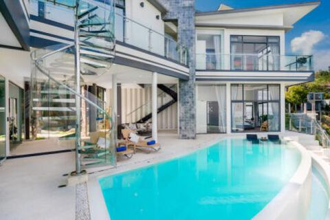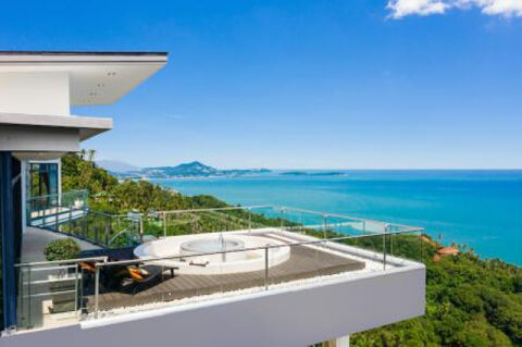 This stunning Koh Samui property for sale is spread over three floors and offers the unforgettable experience of luxurious tropical living and enjoys jaw dropping 180 degree panoramic views to the blue waters of Chaweng Bay and the North East coast of Koh Samui. On entering the villa, imposing wooden double doors open onto the expansive main floor of the property and to a spacious covered terrace with an inviting 36 sqm infinity edge swimming pool with the spectacular coastal and sea views! The main floor comprises of an airy open plan living and dining area along with a fully equipped kitchen featuring a breakfast bar and to the rear is a guest wc. A generously sized guest bedroom features ensuite bathroom with a rain shower and opens onto the terrace with a direct access to the pool.