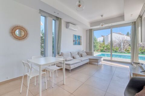 A well presented two bedroom detached villa located in the bustling town of Protaras, close to the National Park of Cape Greco and just a few minutes to the nearest beach. Outside there is off-road parking, an 10x4m tiled swimming pool with outdoor shower area, and established gardens finished with astro turf for low maintenance. Inside the living, kitchen and dining area are open plan with sliding doors leading outside to the rear veranda and pool. The kitchen is fully fitted with a plumbed in washing machine and dishwasher and has granite worktops. On the first floor there are two double bedrooms with fitted wardrobes and access to private balcony's and a fully tiled family bathroom with a large walk-in shower.