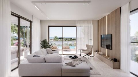 Each residence is thoughtfully designed to embrace Cyprus' stunning natural environment and year-round sunshine, providing a serene and comfortable living experience. The mosaic-tiled private pool is nestled within a landscaped, walled garden, complemented by a spacious terrace, perfect for sunbathing and outdoor dining. Inside, an open-plan layout seamlessly connects the modern kitchen, dining area, and stylish living space, where floor-to-ceiling sliding double-glazed doors open to the garden, inviting in natural light. Upstairs, 3 generously sized bedrooms all with ensuite, offer privacy and comfort for added convenience.