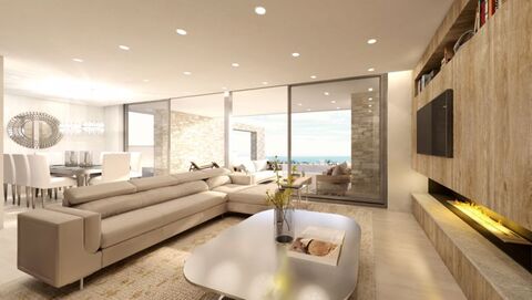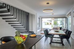 Enter through a large garden into an spacious great room, complete with kitchen island, breakfast bar, dining area, and living room. Large, sliding glass doors open on two sides to a poolside patio, perfect for alfresco dining and relaxation. The infinity swimming pool is 10 m by 3.5 m and has a beautiful view of the garden and area. Upstairs are three large bedrooms, one with an en-suite bathroom and two sharing a family bath. Each have built-in storage and access to a private balcony overlooking the beautiful surrounding countryside. Upstairs a bit further is a large roof garden with panoramic sea views.