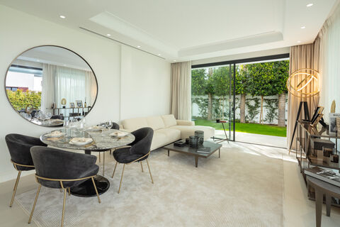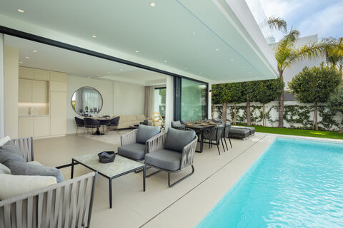 introducing a masterpiece of contemporary living in the prestigious Rio Verde area, nestled along the beachside of the Marbella Golden Mile. These modern villa epitomize coastal elegance with their sleek architectural lines and the iconic white exterior reminiscent of traditional coastal homes. The contemporary kitchen is a fusion of style and functionality, providing ample storage and a seamless flow to the expansive outdoor spaces - a true sanctuary for year-round enjoyment of Marbella's delightful climate. inside, the interiors exude an air of elegance and sophistication, adorned in a soothing palette that creates a tranquil atmosphere. This villa offers generously proportioned spaces and a host of lavish amenities. Boasting 3 bedrooms, each exuding its own unique allure and featuring direct access to a private terrace. The open-plan living areas effortlessly connect with the outdoor terraces and gardens, creating an idyllic setting for entertaining guests and savoring the Mediterranean lifestyle. This villa is a true modern gem by the sea, promising luxurious contemporary living in an unparalleled location.