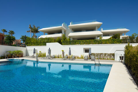 This residence stands as a striking, newly-constructed modern semi-detached villa, part of an exclusive project featuring 11 prestigious residences. Situated within a gated community in Nueva Andalucia, it presents a distinctive and captivating approach to modern architecture, characterized by clean lines and a commanding geometric facade. The exterior, adorned with neutral-toned natural materials, exudes an added touch of elegance.