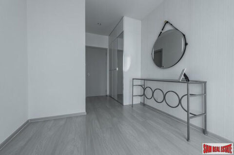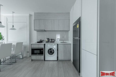 This is a nicely decorated two bedroom, two bath condo in the Life 48. Located on the 23rd floor, the apartment offers amazing city views of Bangkok's skyline. There is an open living plan that starts with the living room that leads out to the balcony. It has a sofa, coffee table and wall mounted TV. Behind that is the dining area with a table that seats four. Next is the fully outfitted western kitchen. It includes a stovetop, microwave, refrigerator and washing machine. The cabinets are light wood that match the flooring. This room is decorated in matching white tones.