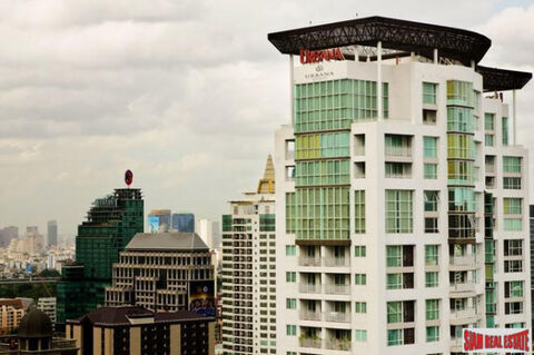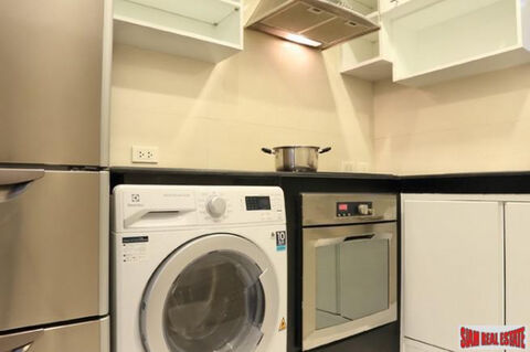 Newly renovated 2 bedroom, 1.5 bath condo on the 20th floor is being offered for sale in the Urbana Langsuan. There is a big open living space that has a sofa, coffee table, TV, shelving and dining area. The western kitchen is nearby and is fully equipped with a stovetop, oven, microwave, refrigerator and a washing machine.