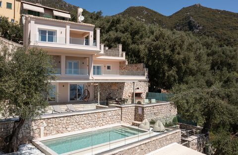 Built in 2015, this four-bedroom villa covers 186 m2 on a 750 m2 plot, combining clean design with uninterrupted views over the Ionian Sea. Spread across three levels, the home has been planned to make the most of the natural light and the open surroundings. The main entrance opens into a spacious living area with large glass doors that lead straight out to a wide balcony — the perfect spot to unwind or share an evening meal outdoors. Inside, the open-plan kitchen connects easily with the dining space for eight, keeping the whole top level bright and sociable.