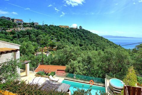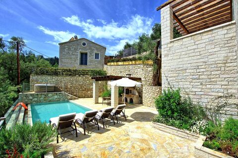 This 2-bedroom villa is set on a quiet hillside in Agni Bay, within walking distance of the bay and its seaside tavernas. The property sits on private grounds with paved paths, flower beds, and a small lawn. The outdoor area includes a 7x3m heated swimming pool, hot tub, and a built-in BBQ with a covered dining area, offering easy spaces for relaxing and entertaining. The villa is 120 sqm over two levels, with the upper floor featuring a kitchen and dining area, living room opening onto the pool terrace, and guest WC. The lower level has two bedrooms with en-suite bathrooms and direct access to a private patio.