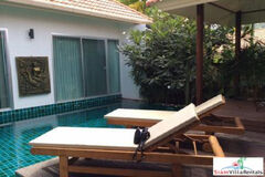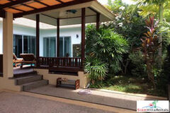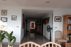 The accommodation comprise of a large living room leading to the kitchen and to two king sized bedrooms, both with private ensuite bathrooms. The living room leads out to a covered dining area which can seat up to eight. This faces onto the pool and the tropical garden at the far end with the mountains in the background. The villa is surrounded by a 2.5 meter wall and an automatic gate to the parking area which provides very good security.