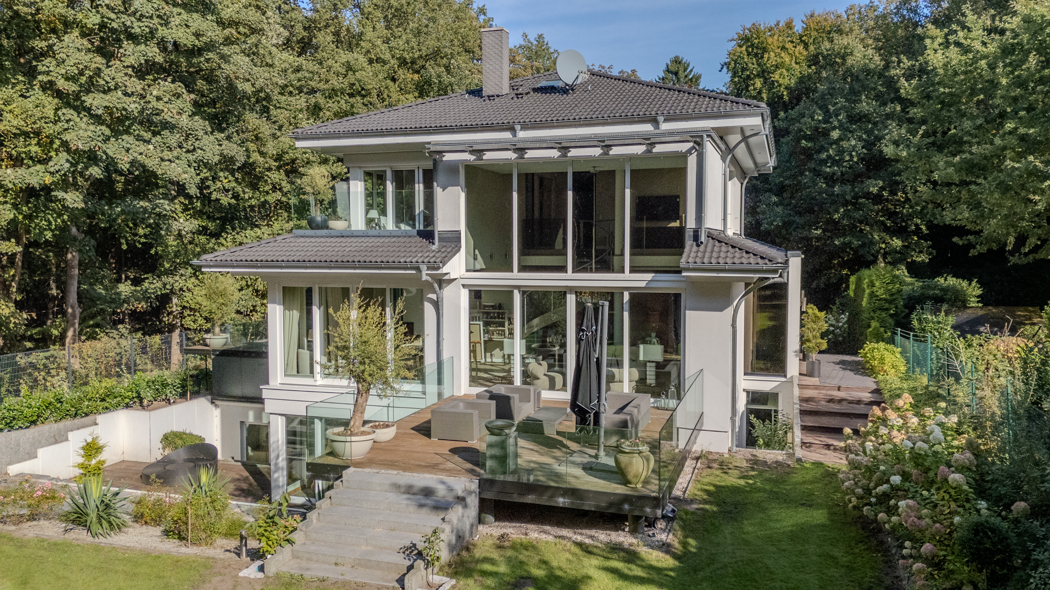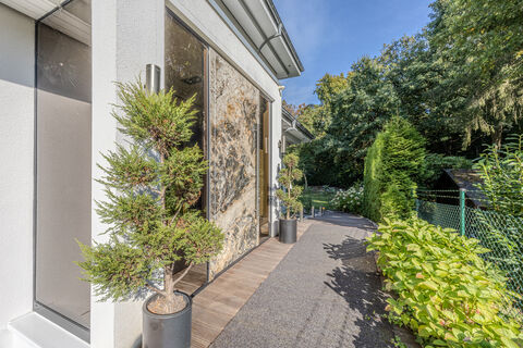 Die Besonderheit: Das smarte Design mit zwei separaten Hauseingangen bietet einzigartige Flexibilitat fur die perfekte Kombination aus Wohnen & Arbeiten, Gaste oder ein Au-pair. Hier verschmelzen luxurioser Komfort und familiare Geborgenheit zu einem perfekten Zuhause.