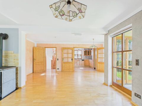 Bereits beim Eintreten empfangt Sie ein heller, freundlicher Eingangsbereich, der in den offenen Wohn- und Essbereich fuhrt. Grosse Fenster fluten die Raume mit Licht und schaffen eine Atmosphare, in der man sich sofort wohlfuhlt. im Herzen des Hauses sorgt der Kamin fur behagliche Warme - der perfekte Ort fur gemeinsame Abende, gute Gesprache und entspannte Stunden im Schein des Feuers.
