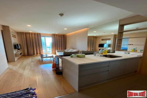 A large and fully furnished one bedroom, one bath condo in The Address Asoke is situated on the 21st floor with unblocked city views. The open living space is bright and cheerful with light color furniture and wood flooring. There is a living room with sofa and TV and a fully equipped western kitchen. The kitchen includes a stovetop, microwave, refrigerator and washing machine. A breakfast bar with two chairs is the dining station and a big mirror on the wall next to it gives the room the feeling of extra space.