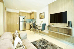 There is an open living plan with a sofa, white shelving unit, flat screen TV, two person dining area and western kitchen. There are floor to ceiling windows and a mirrored wall by the dining table that gives the room a spacious feeling. The kitchen is equipped with a stovetop, microwave, refrigerator and washing machine.