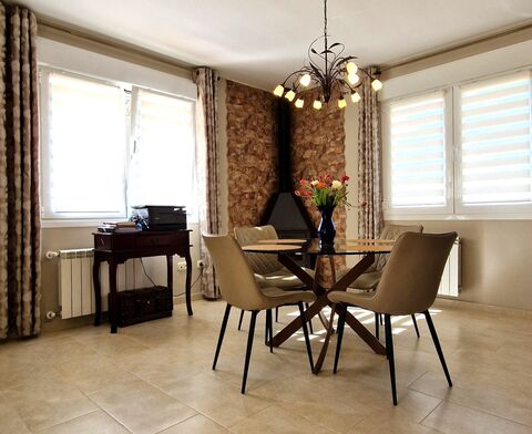 The main living area is on one floor, featuring three spacious bedrooms and two bathrooms, along with a modern, fully equipped kitchen. The kitchen seamlessly connects to a cozy living-dining area with a fireplace, which opens onto a terrace by the private pool, perfect for enjoying time with family and friends.