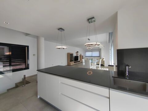 From the hallway you go upstairs to the spacious living room with open plan kitchen (fully fitted) and access to a large terrace with panoramic sea views. On the ground floor there are 2 more bedrooms and a bathroom and laundry room from these bedrooms you have access to the pool area with barbecue and a small garden.