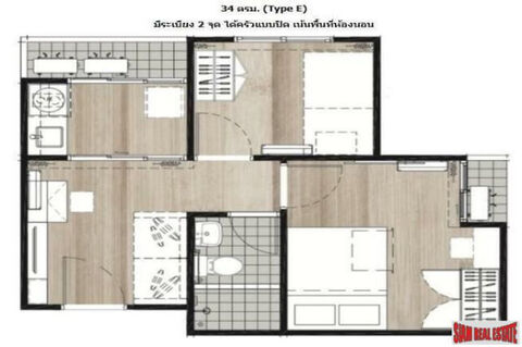 This is a two bedroom, one bath condo for sale in the Notting Hill, Sukhumvit 105. It is situated on the 4th floor, building E. The complex consists of six building, each with eight floors. This room type is one of the most popular and best selling since pre-sell and has only 28 rooms like this in the entire project.