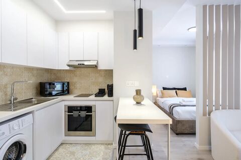 - Compact yet luxurious: Our studio apartment in Limassol offers a modern, fully equipped living space with premium amenities like a Marshall speaker system and Nespresso machine to elevate your stay.