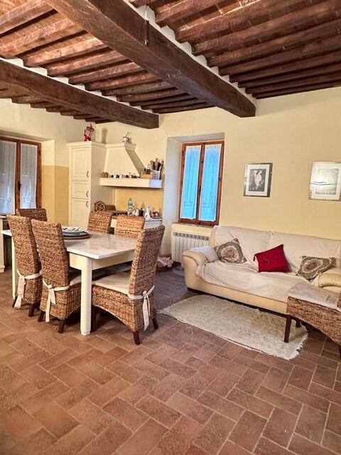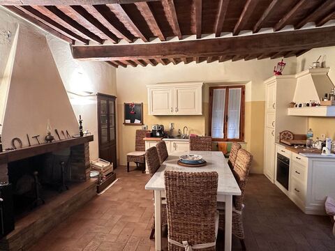 The upper floor hosts another double bedroom, a single bedroom, and a second bathroom with shower. interiors feature exposed wooden beams and 70 cm thick walls, preserving the authentic Tuscan character. The property is equipped with double glazing, new windows on the upper floor, and a 300-liter water tank for emergency use. it is sold fully furnished with custom-made artisan furniture.