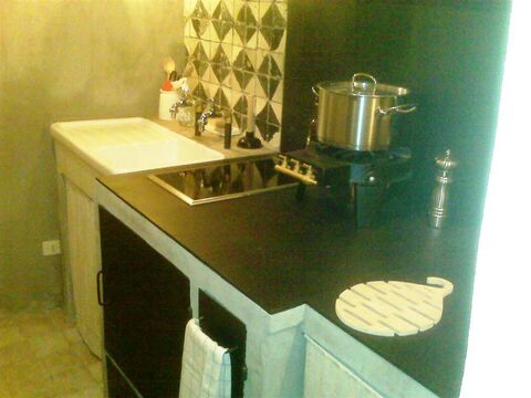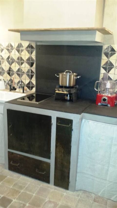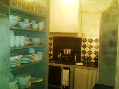 On the ground floor, a welcoming and character-filled space features a living room, study corner, dining area, and kitchen with stunning 18th-century brick vaulted ceilings. The electric cooktop adds a contemporary touch, and a bathroom with a sink and shower completes this level, which was originally part of the home's old storage rooms.