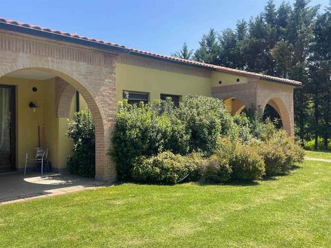 The property is set on approximately 2.6 hectares of flat land, partly landscaped with an English-style lawn featuring a barbecue area and a playground for children. A 12x6 meter swimming pool offers a perfect relaxation spot. The property includes a well for water supply and a commercial building of about 250 sqm that can be converted into residential space. Additionally, a small agricultural annex to be restored and around 2 hectares of arable land complete the property.