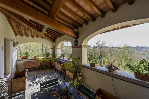 This historic estate is located in the rolling hills of Laterina Pergine Valdarno (Arezzo), offering breathtaking panoramic views of the Arno River valley and the renowned Tuscan art triangle of Arezzo-Siena-Florence. The property features two main buildings with a total surface of approx. 590 sqm, surrounded by 3 hectares of private land including woodland, a stream, and a small natural waterfall.
