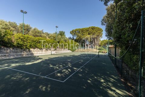 The villa spans two levels and includes a gym, a hot tub, a panoramic swimming pool, a sun terrace, and a tennis court. A private residential driveway ensures great privacy and tranquility while maintaining proximity to nearby services and towns.