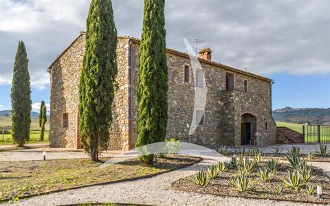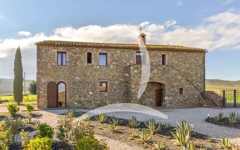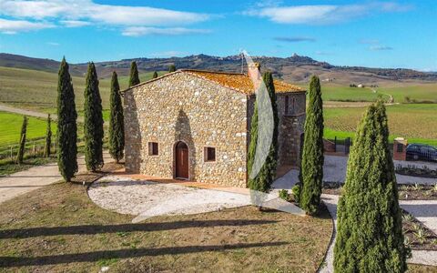 Set in the heart of Val d'Orcia, in a private hilltop position just a short distance from Pienza and San Quirico d'Orcia, this approx. 300 sqm farmhouse is nearing completion and will be delivered fully finished. The home is arranged over two levels connected by an internal staircase, while a traditional external stone staircase also provides independent access to the upper floor, offering excellent flexibility of use. The ground floor features a generous lounge with open-plan kitchen designed for convivial living, plus a bedroom, a large bathroom and a practical storage room, with bright interiors and a functional contemporary layout. The first floor hosts a spacious sitting room centered around the original fireplace, a historic and striking feature of the house, and four bedrooms, each with its own en suite bathroom. in total, the property offers five bedrooms and five bathrooms, a rare configuration that makes it ideal both as a prestigious residence and for high-end hospitality use.