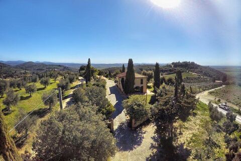 The property is surrounded by a Mediterranean garden of 1 hectare, filled with cypress trees, pines, and olive groves. A large gravel courtyard leads to the house, and the outdoor living areas are designed to enjoy the surrounding nature. The large covered terraces, perfect for dining al fresco, offer views over the Tuscan countryside, and there is a barbecue area with a stone oven. The garden has several areas for relaxation, and the panoramic view of the surrounding hills and the sea makes it the perfect place for enjoying the sunsets. The property is equipped with a spacious parking area and is easily accessible via a well-maintained country road.