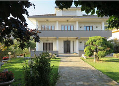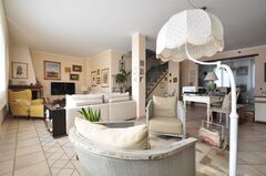 On the upper floor, accessible via a central staircase from the living room, there are four rooms, a bathroom, and an additional terrace. The property also includes a garage in the basement, easily accessible by private elevator.