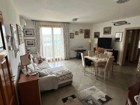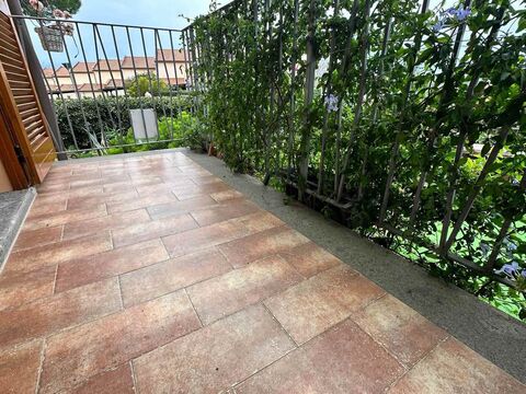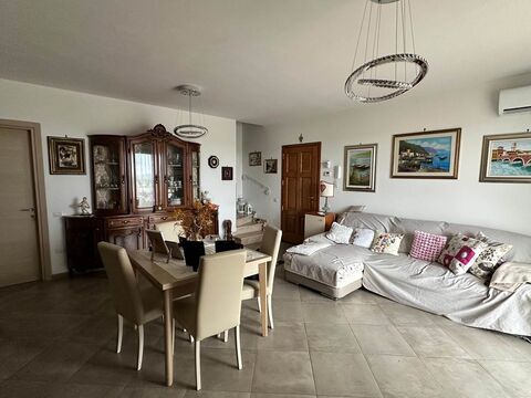 This semi-detached villa, spanning two levels and approximately 160 sqm, is in excellent condition. The ground floor features an entrance leading to a spacious living room with a balcony, a semi-habitable kitchen with access to a covered terrace and rear garden, a hallway, a small bedroom, and a bathroom with a shower. internal stairs lead to the first floor, which houses the night area, including the master bedroom with access to a large terrace and en-suite bathroom with a bathtub and shower, two double bedrooms (both with access to a balcony), a hallway, and an additional bathroom with a shower. The basement includes a tavern with a bathroom, accessible via internal stairs from the living room. The property features underfloor heating (on both levels), air conditioning, a central vacuum system, water softener, and a solar panel supporting the condensing boiler.