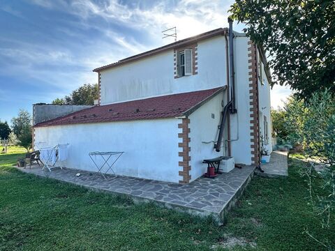 The farmhouse is surrounded by a beautifully maintained 1,800 sqm garden and a flat agricultural plot of about 7,800 sqm, hosting 100 productive olive trees, fruit trees, a well, and agricultural outbuildings totaling about 65 sqm used as storage and tool sheds.