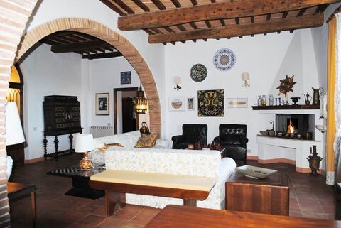 The living area is completed by a spacious kitchen with barbecue fireplace, a separate lounge, and a guest bathroom with shower. A wide hallway with vaulted ceiling leads to the sleeping area, which includes three bedrooms and two bathrooms. The east-facing bedrooms boast magnificent vaulted ceilings and offer a spectacular view of the Val di Chiana and Citta della Pieve.