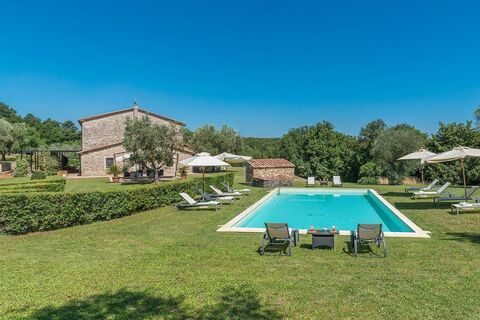 Typical Tuscan farmhouse, with strict proportions and an area of 380 square meters developed on two floors. Characterized by travertine and local stone exterior walls, the interior features a large hall with two large round travertine arches and a straight staircase connecting the floors. On the ground floor we find a charming entrance hall with bar area, a large living room with fireplace, relaxation room, dining room and equipped kitchen, 2 bedrooms and 3 bathrooms; on the second floor, 4 bedrooms with related private bathrooms. inside the farmhouse, there are 10 graffiti works created by a famous artist, unique works that give this prestigious residence an almost museum-like atmosphere. Outside, a large 80-square-meter pergola is ideal for outdoor dining. A few meters from the farmhouse, raised by about two meters, is a renovated 210-square-meter outbuilding on one level, consisting of a large open-space, 2 additional bedrooms and a bathroom. The surrounding garden includes a 6 x 12-meter private swimming pool, green and ornamental areas, terraces with exterior stone walls and stairs, and ample parking. The external area of the property, perfectly maintained, is 3.11 hectares and also includes a small olive grove with about 50 plants. Option to purchase (+500,000 euros) additional 65 ha, including land planted with olive trees (about 4,000 plants) and forest. The farmhouse was completely renovated between 2001 and 2005, preserving the typical elements of the original structure. The exterior and interior finishes of the annex respect the general level of quality of the main house. The property offers all the necessary utilities and has great potential as a private residence or second home, as well as being suitable for luxury tourist rentals
