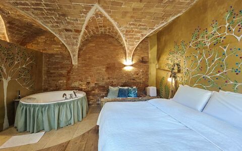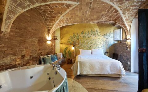 in the heart of an authentic Tuscan hamlet near Volterra, this 125 sqm apartment currently used as a boutique B&B offers three independent suites, each with private entrance, bathroom and whirlpool tub. The restoration preserved original architectural elements such as brick vaults and cross ceilings, creating elegant and welcoming interiors. On the ground floor is a 40 sqm suite created from a former stable, while the upper floor hosts two additional suites totaling 64 sqm. The 21 sqm kitchen, also with independent access, is equipped for breakfasts and light meals and opens onto a panoramic outdoor space. Each room is air-conditioned, features autonomous heating and comes fully furnished, suitable both for hospitality use and as an elegant private residence.