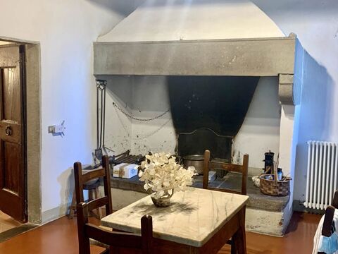 The property retains its authentic charm with wooden beam ceilings, antique terracotta floors, pietra serena staircases, brick archways, and large fireplaces, creating a quintessential Tuscan ambiance.