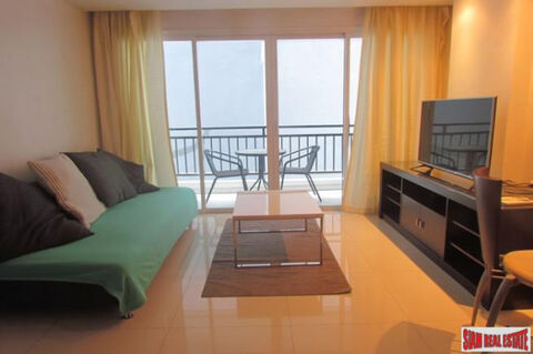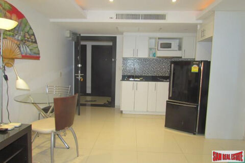 Pool views from this one bedroom condo for sale in Pattaya City. The apartment has a spacious open living plan with a sofa, TV, dining table that seats two and western kitchen. The kitchen has a stove top, microwave and big refrigerator. Leading off the living room is a large balcony with seating - great place to enjoy the pool view.