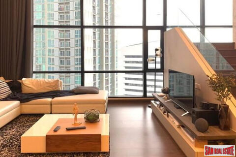 Fantastic location on Ratchadapisek road, only 200m to MRT Thai Cultural Centre Station. This is a three bedroom, three bath duplex condo situated on a high floor with great views. There is an open living plan with a high ceiling that offers bright natural light. The living room contains a large sofa, dining table that seats four and a fully equipped modern western kitchen with an island-style work counter.