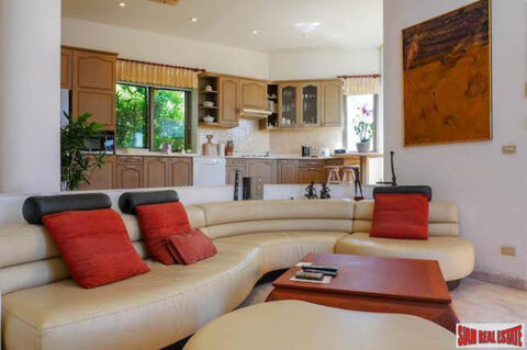 The nicely designed kitchen comes with a big refrigerator, freezer, microwave, gas stove top and dishwasher. This room also has lots of wood cabinets and counter space. There is a maid's quarters for a live-in maid, laundry room and a Thai kitchen at the back of the living area. Mature gardens with a sprinkler system surrounds the home. It is a manageable size and well maintained.