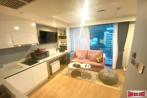 A one bedroom modern-style apartment with a hotel manage rental program. The unit has an open living plan with a sofa, TV, dining table and equipped western kitchen. The kitchen includes a stovetop, microwave, refrigerator, cookware and dishes. Inside the bedroom is a big bed, wall mounted TV, large wardrobe and ensuite bathroom. There is wood flooring though out the unit.