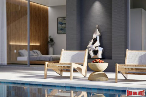 Covered parking at these Koh Samui contemporary villas grants your arrival into the lush garden, where pathway delivers you straight to the property. Windows soar and the ceiling height takes on dramatic angle, beckoning you into an enchanting world of style and luxury. Rich natural textures combine with the expansive scale to create livable art throughout in a contemporary open layout. The intelligently designed kitchen includes plenty of space and light for preparing the perfect meal or starting your morning just right. The breakfast bar creates additional seating for great conversations. A generously sized dining area makes an idyllic spot for casual or formal meals while glass doors frame lush, verdant vistas of the pool terrace and garden beyond. Privacy and seclusion abound in your walled-in yard where a terrace surrounded by greenery allows outdoor relaxation and alfresco dining. Within the main building is the master suite retreat, where you can dream away in a room of utmost elegance and comfort complete with ensuite bathroom offering shower, separate soaking tub and double basins. A separate building houses two additional bedrooms, all of which are ensuite, and all overlook the pool with direct terrace access.