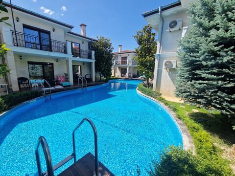 2 BED 2 BATH house, 116 sq.m., with a fire-place in Ravda, 700 m to the sea We are pleased to offer you a fully furnished 2 storey house, which is part of a small complex in Ravda seaside village. Distance to the beach - appr. 700 m. The house is two-storey and has a total area: 116 sq m. It comprises of: - 1st floor: spacious living room with fireplace, fully equipped kitchen, storage, bathroom and terrace with direct access to the pool; - 2nd floor: two bright bedrooms, bathroom and three terraces. - The house is offered fully furnished and ready to use as shown on the photos. Act 16. Fireplace and air-conditions. Outdoor pool right next to your terrace Maintenance fee: 1000 EUR per year if you use the pool; 500 EUR if you don't use the pool. Ravda is a summer seaside resort, famous in the past for its numerous childrens, school and student holiday camps. There are regular bus lines to Burgas (30 min), Sunny Beach (20 min) and Nessebar (10 min). Today the resort has hotels, private accommodation, restaurants and discos. Village population is about 3000 people.