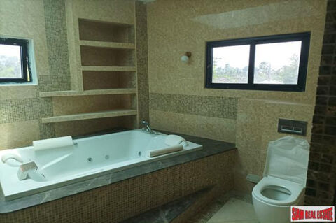 This is a two storey, four bedroom pool villa for sale in Na Jomtien, Pattaya. The house has 450 sqm internal living space and the land plot is a large 1,508 sqm. Constructed with double walls (thermos) and thermal insulation on the ceiling of the 2nd floor and roof, keeping the home cool and nice.