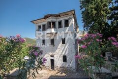 The house features traditional architectural elements with a tiled roof, whitewashed walls, and blue shutters, blending harmoniously into the surrounding landscape. The spaces are bright and functional, and the standout feature remains the breathtaking view over both the lake and the sea.