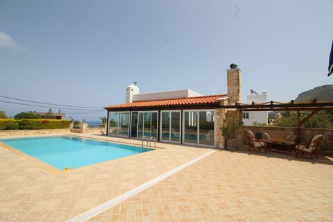 You enter the property through the main door which is located up some steps, and find yourself in the hall way which features built in cupboards for storage purposes. There is a large open plan living, dining and kitchen area. The living area has a wood burning stove and views out to Plaka and Souda Bay. The kitchen has nice, wooden style cupboards and views out to the garden. From the living room, is a lovely sun room. This room has sliding doors and easy access to the pool and terrace area. The sun room has plenty of space to dine and relax and is even fitted with an open fire place for cosy evenings.