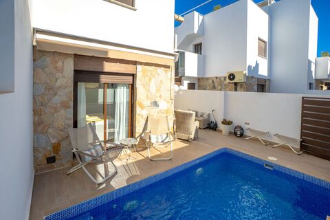 In a pleasant urbanization in Lomas de Cabo Roig is this modern townhouse with private heated pool, roof terrace and garage space with storage room.