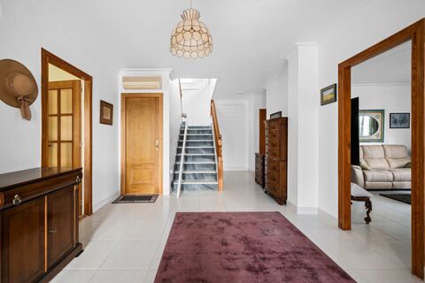 Upstairs, the villa continues to impress with four more spacious bedrooms, offering ample accommodation for a large family or visiting guests. The master suite is a luxurious retreat, complete with an en-suite bathroom and walk-in closet. Two additional bedrooms also feature walk-in closets, and all rooms on this level are bright and airy. A shared bathroom serves the upper floor, and a sunny terrace offers breathtaking views of the gardens and surrounding countryside—an ideal place to unwind and take in the scenery.