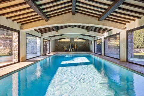 Ein angrenzendes Gebaude beherbergt einen beheizten innenpool, der von sechs grossen Schiebeturen umgeben ist, die eine vollstandige Offnung zu den angrenzenden Terrassen ermoglichen. Dieser Ort der Entspannung wird durch eine Sauna, eine Badewanne und eine Dusche erganzt und bietet Momente der absoluten Entspannung in einem intimen und beruhigenden Rahmen.