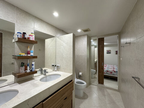 Inside the bedroom is a contemporary ensuite bathroom. The furniture is wood and includes a bed, night tables and lamps.
