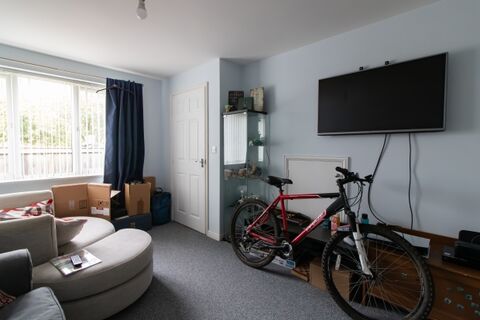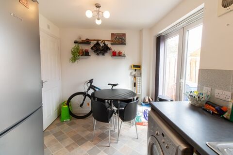 A convenient ground-floor WC adds practicality to the layout. Upstairs, the front-facing main bedroom offers plenty of natural light through a wide window, while a second bedroom at the rear benefits from fitted wardrobes. The bathroom is complete with a three-piece suite including a bath with overhead shower, ceramic hand basin, and WC.